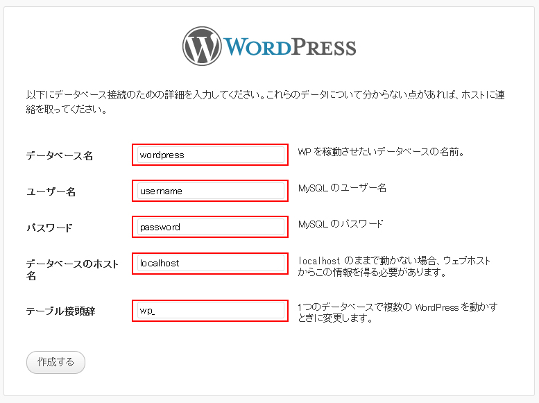 ここでMySQLデータベースを作成した時の情報が必要となります。